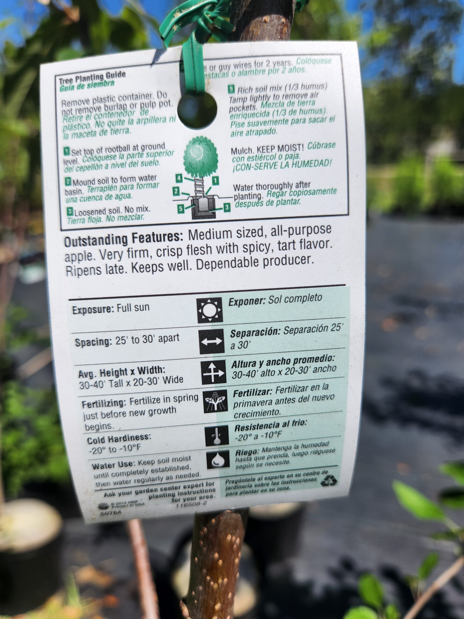 Plant in full sun in well drained loamy soil. The Winesap apple is not self-pollinating and will require cross pollination of another apple variety to achieve fruiting. Gala, Granny Smith, Pink Lady and Golden Delicious are just some of the effective pollinators. Average height 12′ to 15′ and width 12′ to 15′. USDA hardiness zone 5 – 8.